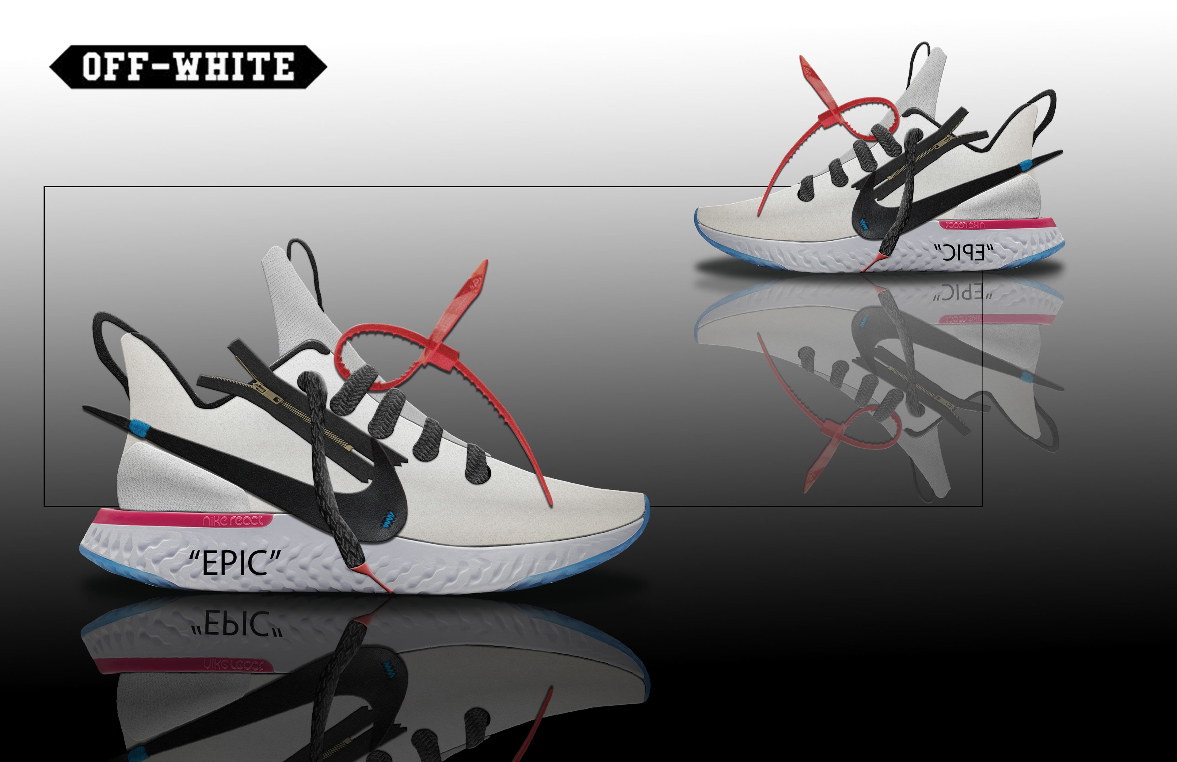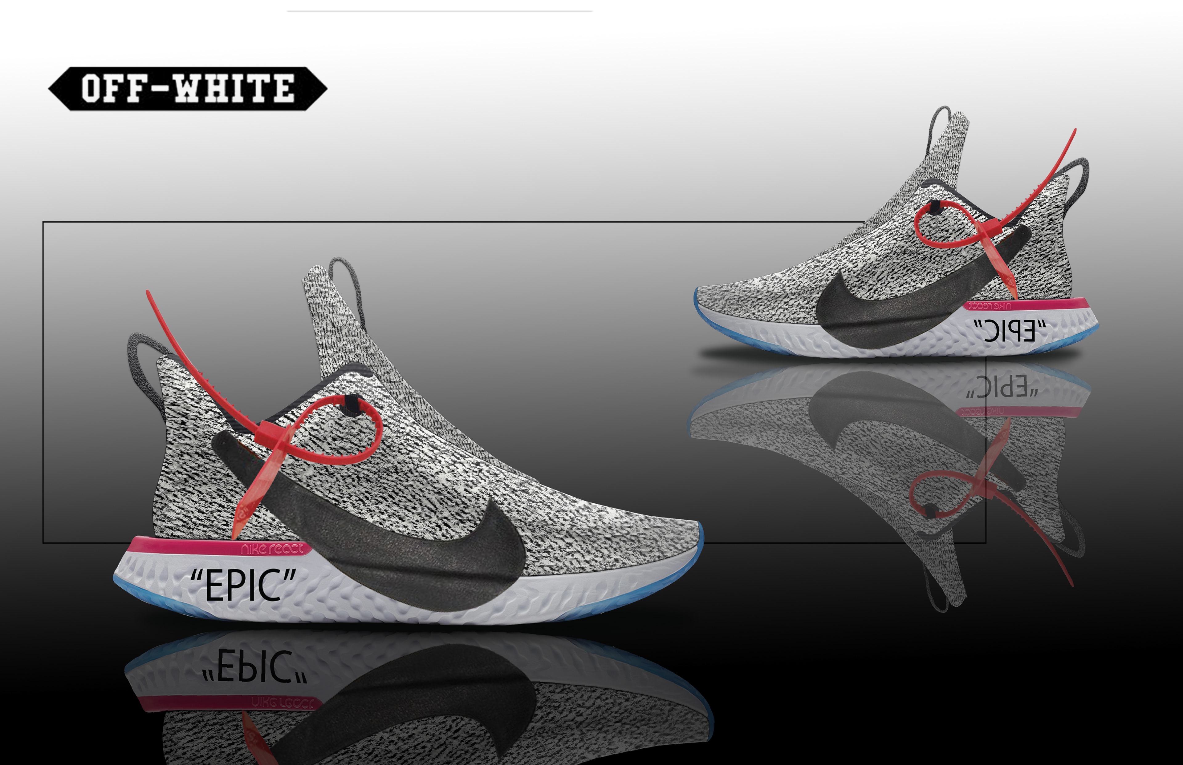 Took the Nike Epic React running shoe mid-sole and put a mid top upper on it. I also wanted to try out an Off-White idea, because it is something very popular and a design I find very interesting.
